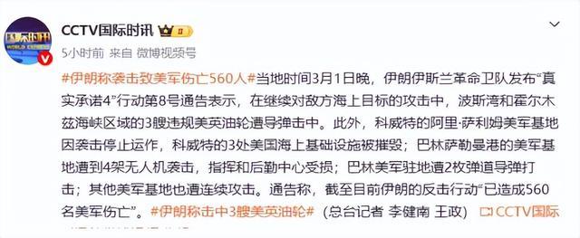 伊朗硬刚美以联军打出硬核反击,官宣造成560名美军伤亡,美“林肯”号航母遭导弹突袭,美英油轮、海外美军基地接连被锤。
