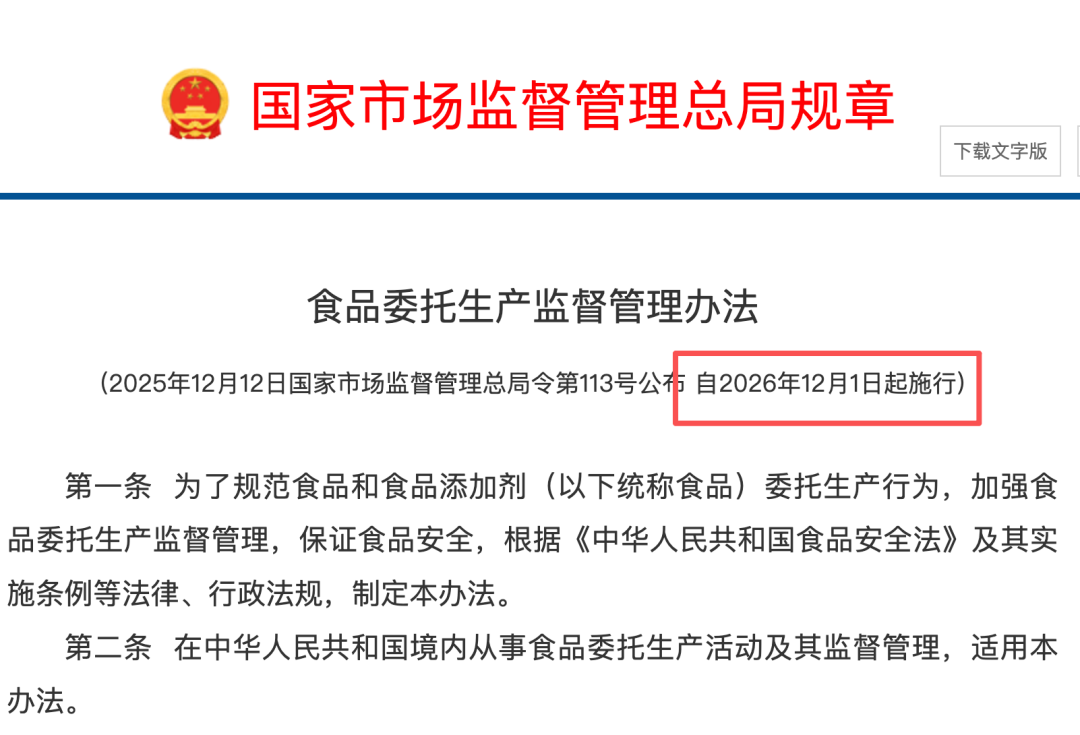 《办法》硬性规定,委托生产的预包装食品,应当在包装紧邻位置标注委托方、受托方的名称、地址、联系方式;同时,委托双方必须建立全流程追溯体系,记录留存期限不少于保质期满后6个月。