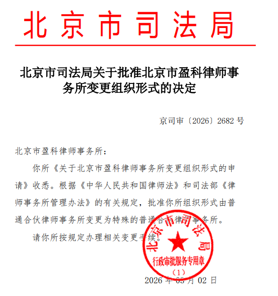 据北京司法局网站,几天前的3月2日,该局批准盈科律所的组织形式,由普通合伙律师事务所,变更为特殊的普通合伙律师事务所。